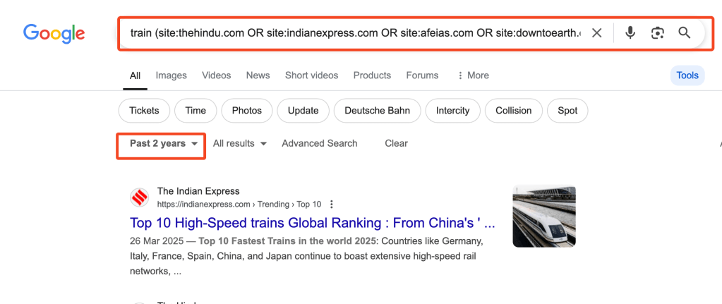 Now the results will be only from News publications like Hindu, IE, DownToEarth, etc and it will exclude entertainment pages. The results will be restricted to articles published in the last 2 years.
